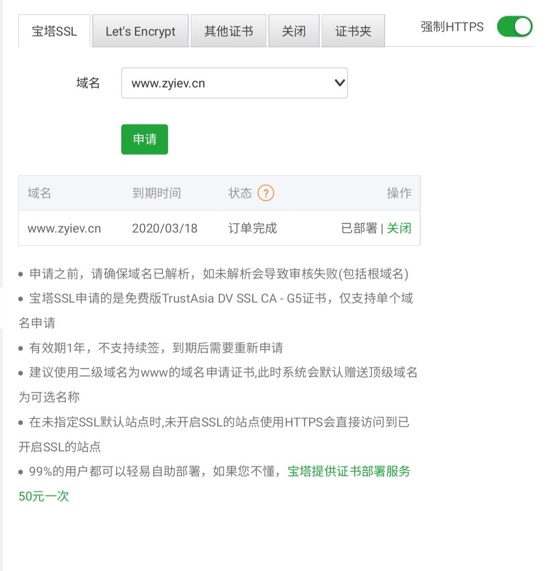 审核通过之后,就是去安装ssl,如果用宝塔面板,宝塔面板可以一条龙服务(申请+安装),特别方便,当然也可以安装刚刚在腾讯云申请的ssl证书,我这里使用宝塔一键:然后点击右上【强制HTTPS】就安装完成啦~